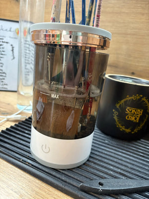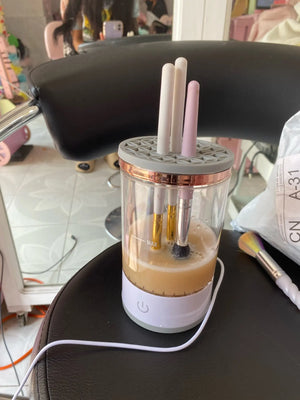 Simply plug it in, attach your brush, and let it spin clean. It's easy and efficient, ensuring spotless brushes every time.